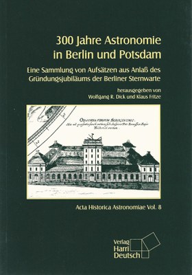 Wolfgang R. Dick, Klaus Fritze (Hrsg.): 300 Jahre Astronomie in Berlin und Potsdam. Eine Sammlung von Aufsätzen aus Anlaß des Gründungsjubiläums der Berliner Sternwarte. (Acta Historica Astronomiae ; 8). Thun ; Frankfurt am Main : Deutsch, 2000, 252 S., ISBN 3-8171-1622-5, 27 Abb., 15 x 21 cm, kartoniert EUR 16.80 / sFr 26.30.