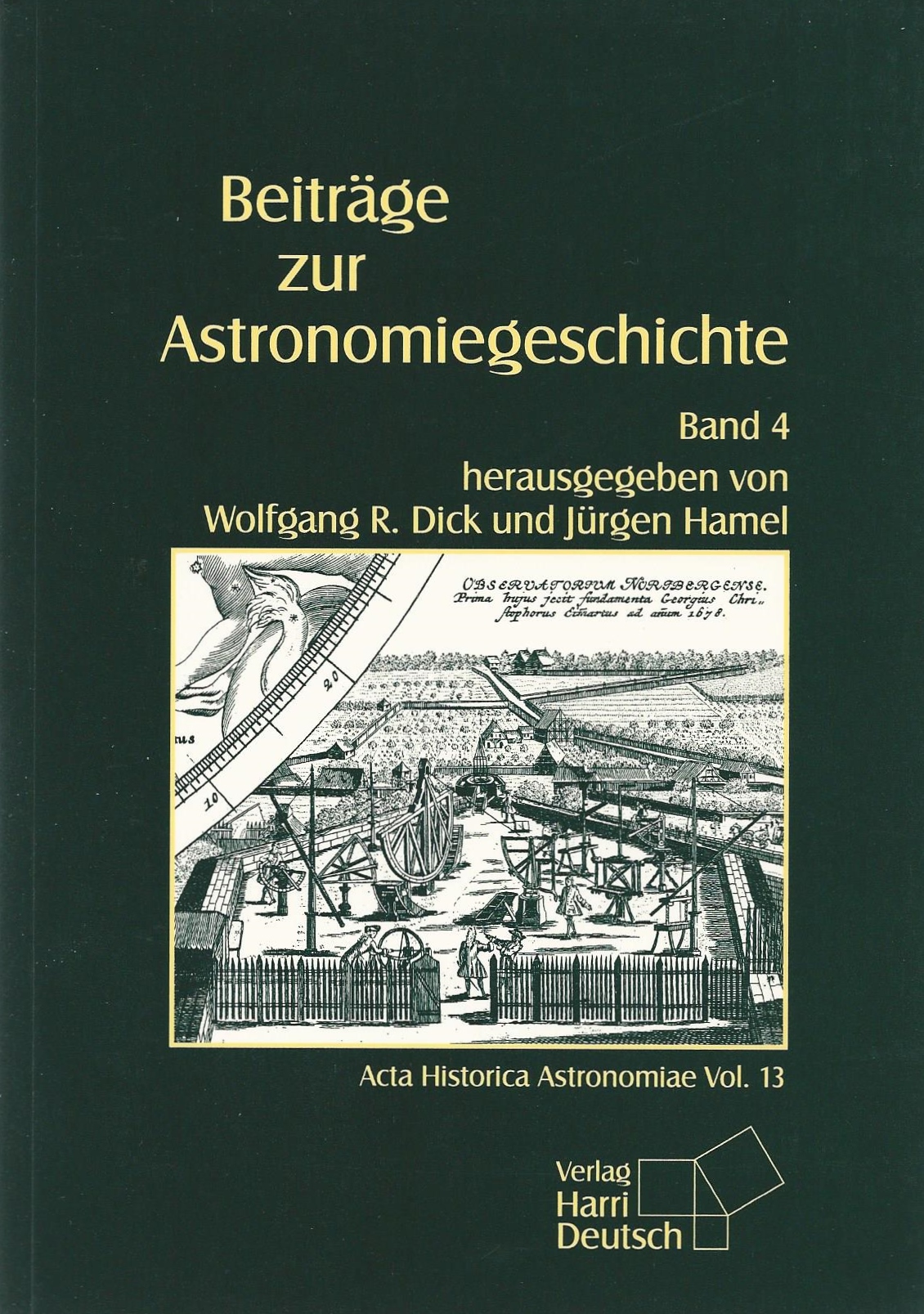Beiträge zur Astronomiegeschichte, Bd. 4. Hrsg. v. Wolfgang R. Dick u. Jürgen Hamel. (Acta Historica Astronomiae; 13). Frankfurt am Main : Deutsch, 2001, 259 S., ISBN 3-8171-1663-2, 45 Abb., 15 x 21 cm, kartoniert EUR 18,80 / sFr 29,40.
