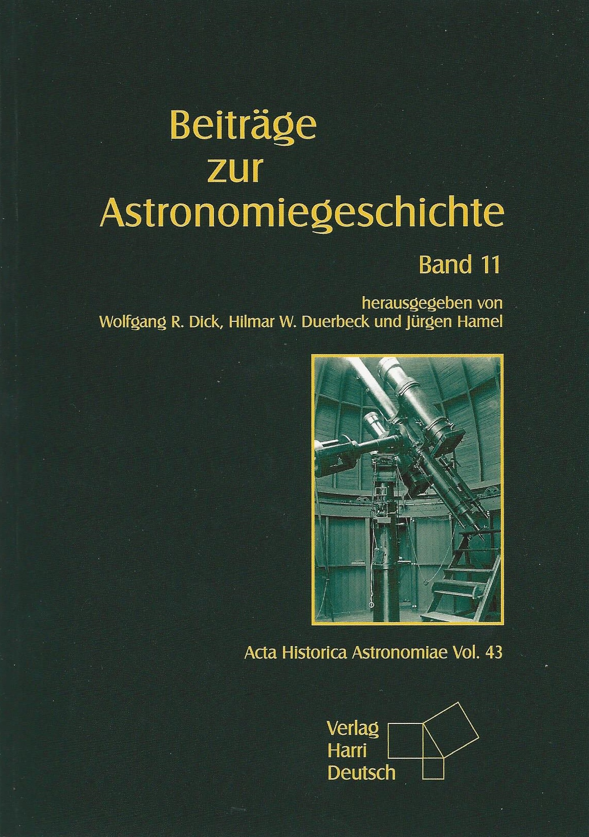 Wolfgang R. Dick, Hilmar W. Duerbeck, Jürgen Hamel (Hrsg.): Beiträge zur Astronomiegeschichte. Band 11 (Acta Historica Astronomiae ; 44). Frankfurt am Main: Verlag Harry Deutsch, 2011, 433 S., ISBN 978-3-8171-1883-0, zahlr. Abb., 15 x 21 cm, Broschur EUR 36,80.